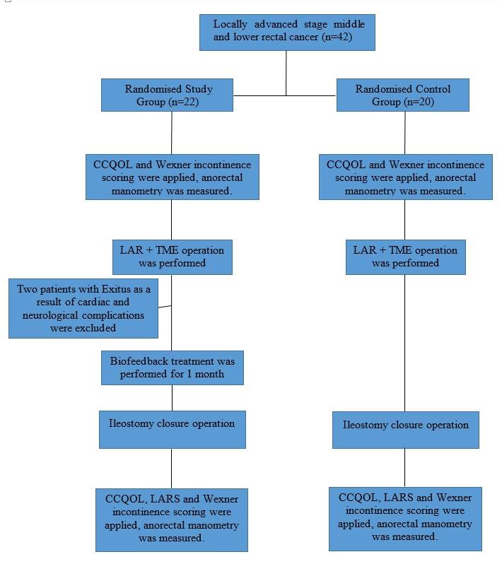 Gereçler ve Yöntem: Çalışmaya, Necmettin Erbakan Üniversitesi Meram Tıp Fakültesi Genel Cerrahi Kliniği’nde düşük anterior rezeksiyon ve koruyucu ileostomi operasyonu geçiren hastalar dahil edilmiştir. Rastgele seçilen 40 hasta, her biri 20 kişiden oluşan iki gruba ayrılmıştır. Çalışma grubundaki hastalara, ileostomi kapatılmadan önce toplam dört hafta süresince, haftada iki seans olmak üzere biofeedback egzersiz tedavisi uygulanmıştır. Kontrol grubundaki hastalar ise bu tür bir terapi almamıştır. Koruyucu ileostomi kapatıldıktan iki hafta sonra her iki grup üzerinde anorektal manometri ölçümleri yapılmıştır. Ayrıca, Cleveland Clinic/Wexner İnkontinans Skoru , düşük anterior rezeksiyon sendromu skoru ve Cleveland Clinic tarafından geliştirilen Yaşam Kalitesi Anketi uygulanarak hastaların klinik durumları değerlendirilmiştir.